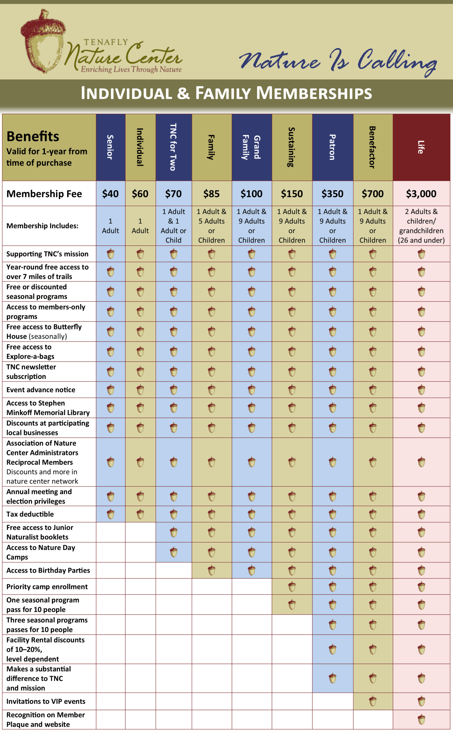 - Access to fee-based Nature Day Camps offered throughout the year (minimum TNC for Two level)